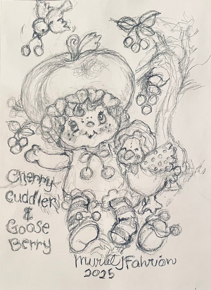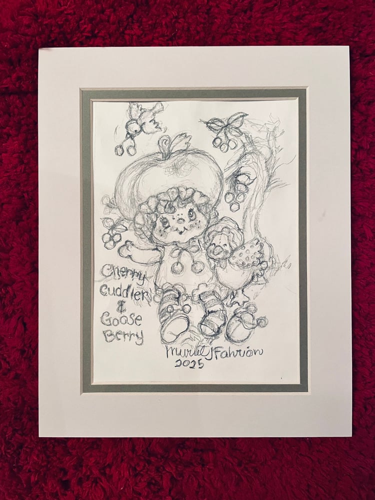 Original pencil sketch signed and dated. 2025. Double matted in a 8 x 10 gray and ecru mat. Drawing size 5 x 7. Cherry Cuddler came right out of my sketch book. I started her on on of my flights and continued working on her in my home studio. She goes up to sale. Sunday Nov 30th at Noon. To be shipped priority.